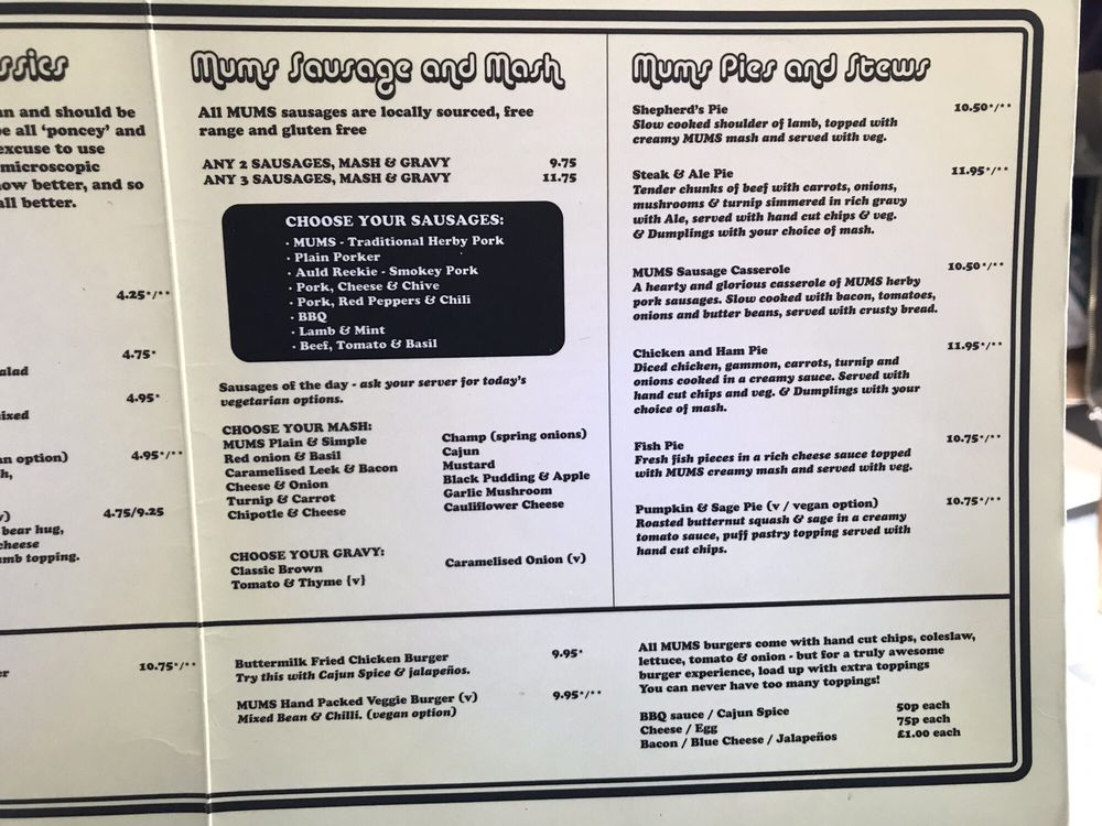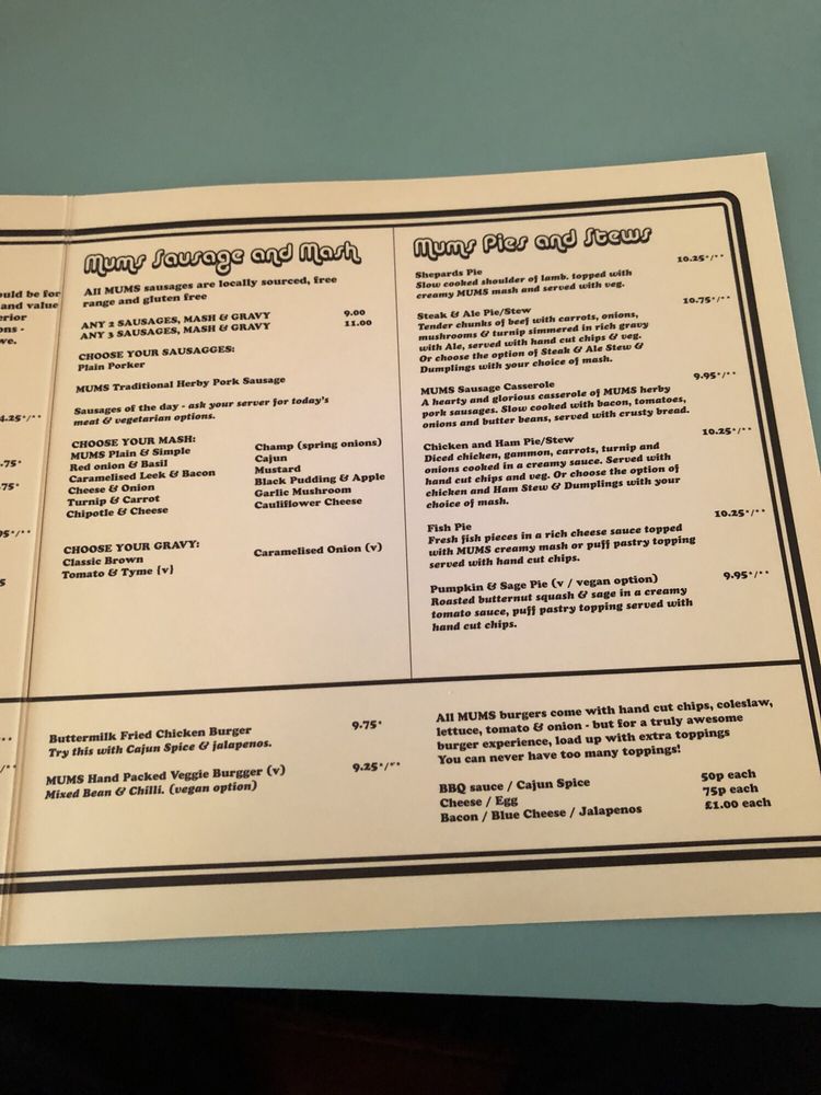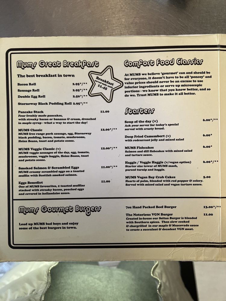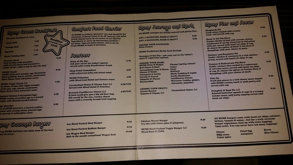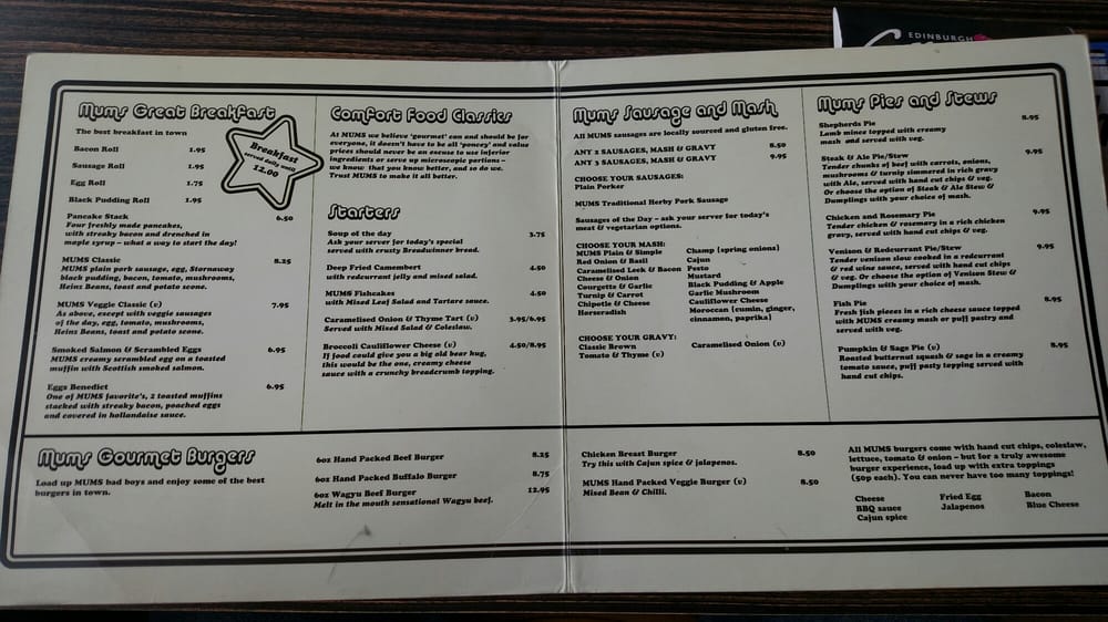 "Introducing the menu of Mums, a cozy burger joint in Edinburgh offering a variety of breakfast and brunch options. Known for their delicious sausage and mash dishes, Mums provides the perfect comfort food with options like Black Pudding & Apple, Cajun, and Cheese & Onion. Their Great Breakfast menu features classics like Bacon Roll and Eggs Benedict, catering to both meat lovers and vegetarians with options like Mums Veggie Classic. Start your meal with appetizers like Broccoli Cauliflower Cheese and Mums Fishcakes, setting the tone for a satisfying dining experience. With a casual atmosphere and options for takeout and delivery, Mums is a great choice for groups, families, or solo diners looking for a hearty meal. Visit Mums for a taste of delectable comfort food that will leave you coming back for more."
